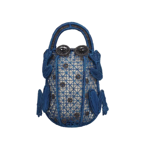 Diseñada por Mercedes Salazar y tejida a mano en rafia por talentosas artesanas colombianas, el Blue Frog Handbag adopta la forma de una rana azul, transformando este elemento natural en un accesorio escultórico y distintivo.