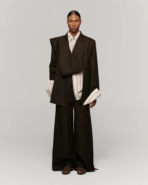 El Traje Ruana es una pieza que desafía los límites entre la sastrería clásica y el gesto dramático: confeccionado en tejido café con líneas al tono, incluye una chaqueta de solapa tradicional con una variación única: un delantero más largo pensado para doblarse sobre el hombro y usarse como una ruana. Las aberturas frontales se cierran con botones forrados, mientras que las mangas integran una botonadura funcional de siete botones. Por dentro, el interior está completamente forrado y todos los botones mantienen la misma tela para garantizar coherencia estética.