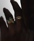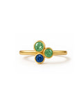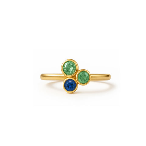 El anillo Eje Celestial – Zafiro organiza tres gemas en un eje escultórico que combina color, brillo y arquitectura. Dos esmeraldas vibrantes enmarcan un zafiro azul profundo, creando un contraste limpio y contemporáneo que se vuelve protagonista sin perder sutileza.