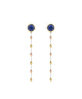 Los aretes Lluvia Azul destaca un Zafiro azul en oro 18k del que desciende una cadena larga con placas geométricas en tres tonos de oro. Una pieza ligera y fluida que acompaña cada movimiento con destellos sutiles.