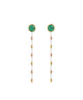 Los aretes Lluvia Verde destaca una esmeralda en oro 18k de la que desciende una cadena larga con placas geométricas en tres tonos de oro. Una pieza ligera y fluida que acompaña cada movimiento con destellos sutiles.