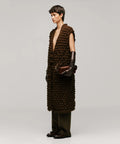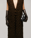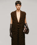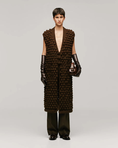 El Chaleco Germinar es tejido íntegramente a mano con la técnica de punto cruz, donde las puntadas adoptan formas circulares en relieve que evocan la semilla y el crecimiento. Su silueta recta se integra con un escote profundo en “V” que expone de manera elegante el torso, mientras que la botonadura frontal con 3 botones tejidos aporta carácter artesanal y atención al detalle.