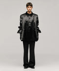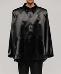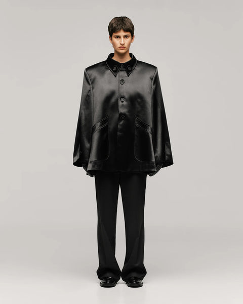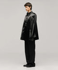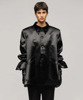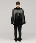 El Abrigo Lluvia es una reinterpretación brillante del clásico abrigo de paño, concebido para marcar presencia en cada espacio urbano. Su acabado negro luminoso transforma lo sobrio del paño en una piel que respira luz. Con una botonadura frontal de 4 botones forrados, un cuello sport con botones decorativos y bolsillos parche de forma irregular, esta pieza equilibra lo riguroso con lo inesperado. Su silueta oversize acampanada crea un volumen dramático que desafía convenciones sin perder elegancia.