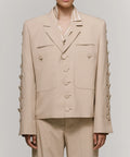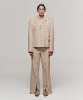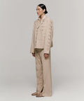 El Traje Azucena es un conjunto sastre de dos piezas confeccionado en tejido beige, que conjuga elegancia estructural con una presencia moderna. La chaqueta corta de silueta recta luce una solapa tradicional y un cierre de cinco botones forrados, acompañada por bolsillos de parche con botón y bolsillos de ribete a la altura del pecho. Las mangas incorporan una botonadura funcional de nueve botones, un detalle que amplifica su carácter artesanal.