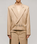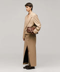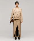 El Traje Surcos es una exploración de líneas, volumen y feminidad estructurada. Este conjunto de dos piezas en tono beige se compone de una chaqueta de corte cuadrado y estructura amplia, con solapa en punta y cierre cruzado de tres botones, y una falda recta midi con una profunda abertura frontal, rematada con un botón forrado al centro.