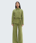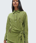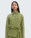 La Blusa cruzada Pilche está confeccionada en lino liviano y diseñada con una silueta cruzada que se ajusta a la cintura. Su cuello clásico y líneas limpias evocan una elegancia atemporal reinterpretada desde lo contemporáneo. Los bordados —inspirados en los dibujos originales de Olga Fisch— añaden una dimensión poética, donde cada figura rescata la memoria de un arte que se borda en el presente.