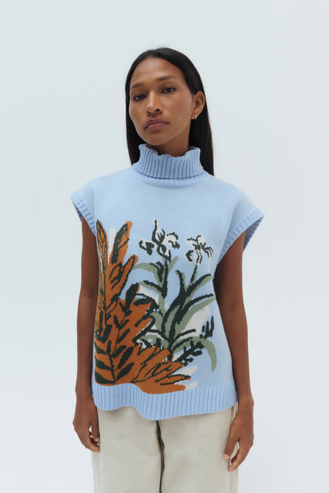 El Chaleco Páramo es una pieza tejida sin mangas que evoca las texturas, colores y formas del ecosistema andino. Confeccionado en una mezcla suave de algodón y viscosa, ofrece una silueta relajada y ligeramente amplia. El motivo tejido recrea la vegetación del páramo, convirtiendo esta prenda en un homenaje al paisaje altoandino y a su biodiversidad.