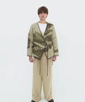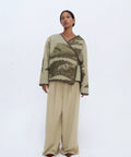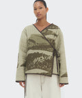 La Chaqueta acolchada Kikuyo combina la estructura del acolchado contemporáneo con la fluidez de un corte cruzado tipo kimono. Confeccionada en algodón suave y pespunte vertical, envuelve el cuerpo con una silueta envolvente que transmite calidez y equilibrio. El estampado abstracto, inspirado en los paisajes andinos, se complementa con vivos en lino y un amarre lateral que refuerza su carácter artesanal y funcional.