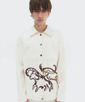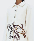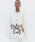 La Chaqueta Utilitaria Mamout reinterpreta la estética clásica del workwear a través del arte textil de Olga Fisch. Confeccionada en denim de algodón estructurado, presenta un corte amplio y relajado con bolsillos funcionales y acabados precisos. Los bordados —inspirados en los motivos gráficos de una de sus alfombras originales— rescatan la fuerza simbólica del dibujo manual, fusionando la artesanía tradicional con una mirada moderna.