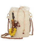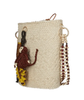 The piece is accompanied by a handcrafted raffia charm in the shape of a marmoset monkey with a small branch and bananas, adding a playful and narrative touch to the design. Its beaded wooden strap adds texture and character, making it an ideal statement accessory for daytime wear, travel, or warm climates.