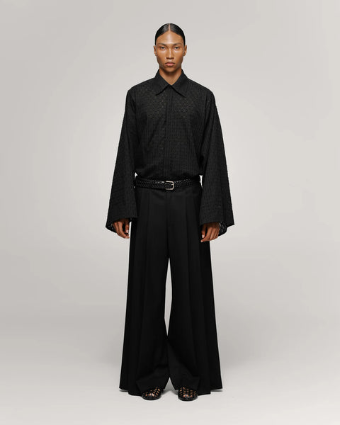 The Shirt Aguacero is an exercise in poetic minimalism: crafted from a white fabric with a light drape, its presence is sustained by the purity of the cut and subtle details. The design includes a hidden placket at the front , a clean vertical line that evokes the silence of the rain. The cuffs end without visible buttons, reinforcing the design's understated aesthetic.