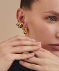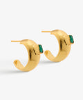 The Hudson Muse Hoops earrings fuse presence and craftsmanship in a voluminous hoop design that stands out for its bold structure and refined details. Crafted in bronze with a 24-karat gold plating, they incorporate raw emeralds alongside a baroque pearl that introduces an unexpected contrast between the minerality of the stone and the organic softness of the mother-of-pearl. Each pair is handmade in Colombia, conceived as a statement piece for those seeking presence, texture, and elegance with a distinct heritage.