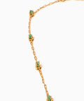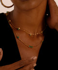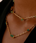 The Puntos Tennis Necklace is a short and elegant piece that fuses artisanal craftsmanship with the power of the Colombian landscape. Handcrafted in bronze and coated in 24-karat gold, it features raw emeralds set in a "fingernail" style, providing a unique and authentic shine. Its minimalist yet distinctive design allows it to be worn alone or layered, adapting to different moments of the day with refined sophistication.