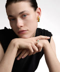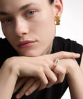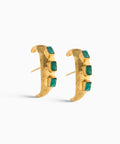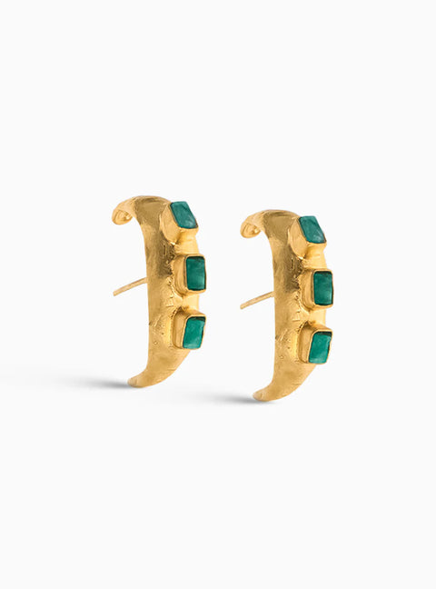 The Fura Largos stud earrings articulate an elongated and refined gesture, distinguished by their understated elegance. Handcrafted in Colombia, their stylized proportions, made of bronze with a 24-karat gold plating, hold raw emeralds that retain their natural, pristine texture. This piece is a fusion of contemporary design precision and the mineral heritage of Colombia: perfect for those seeking a jewel that transcends mere accessory and becomes a symbol of identity.