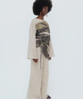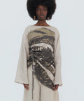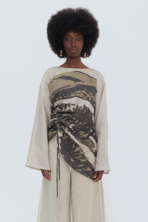 The Kikuyo Shirt is crafted from lightweight, breathable linen, with a side gather that adds shape and definition without sacrificing fluidity. Its abstract print, inspired by Andean landscapes, reinterprets ancient geography with a contemporary perspective. A garment that unites art and texture in a relaxed and refined silhouette.