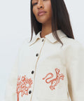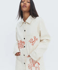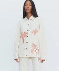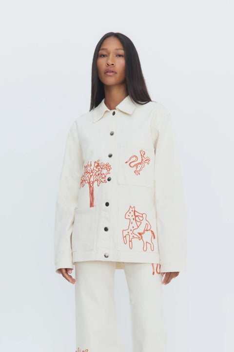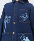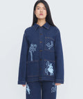 The Munay Jacket reinterprets the classic utility jacket through Olga Fisch's lens. Crafted from durable cotton denim, it combines a loose, relaxed silhouette with original embroidery based on the artist's sketches. Each figure—trees, horses, and organic symbols—turns the fabric into a living canvas where cultural heritage is transformed into contemporary design.
