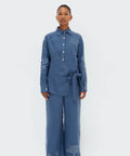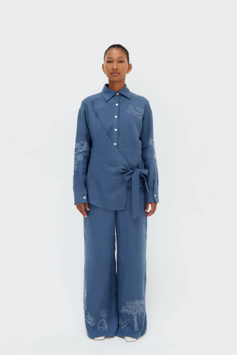 The Munay Linen Pants are crafted from soft, breathable linen with a fluid drape that enhances their natural elegance. Tonal embroidery at the hem reinterprets Olga Fisch's original drawings, evoking the symbolic richness of Ecuadorian folk art. Their high waist and loose fit provide comfort and presence, subtly combining tradition and modernity.