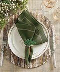 A set of napkin rings that adds a distinctive artisanal touch to your table. The Açai Napkin Rings are handwoven from raffia fiber by Colombian artisans, incorporating a design inspired by the tropical landscape and the spirit of the açai fruit.