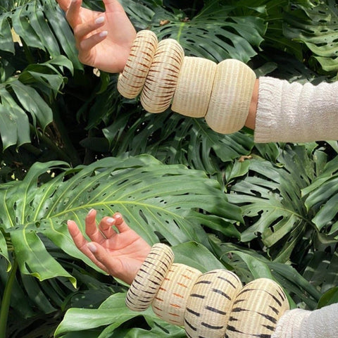 The IRIS WERREGUE BANGLES- SMALL are 100% handmade by indigenous artisan hands from the Wounaan indigenous community using a natural fiber taken from the Werregue Palm Tree from Choco in Colombia, with an option of mixing it in with recycled copper thread, creating beautiful designs inspired by their culture and their relationship with Mother Earth.