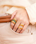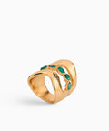 The Trato Ring transforms the essence of Colombian territory into a jewel with a contemporary presence. Its organic structure, 100% handcrafted in Colombia, begins with a 24-karat gold-plated bronze base, embracing small, raw emeralds that retain their original texture and strength. This piece is a testament to the fusion of material, landscape, and craft: a jewel for those who value authenticity and uniqueness.
